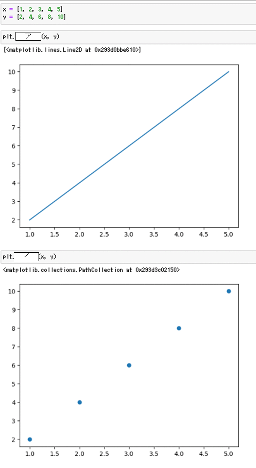 Matplotlibを使用した記述に於いて、ア、イに入る記述を選べ。