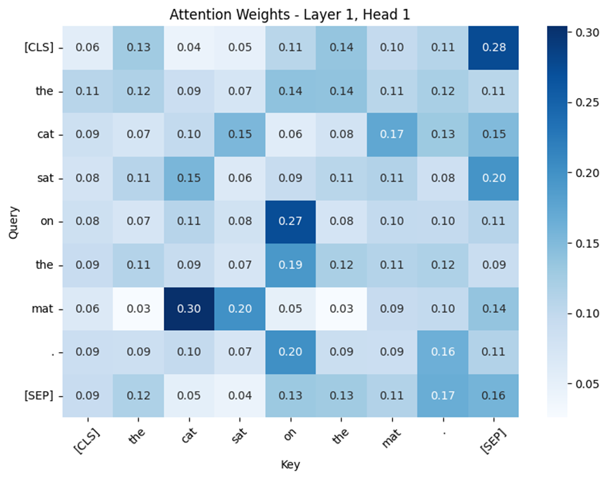 このAttentionマップは、各単語が文中のどの単語に注目しているかを示している。例えば、「cat」が「sat」や「mat」に強く注目している。これは文脈的な関係性(主語と動詞、対象物)を捉えていることを意味する。