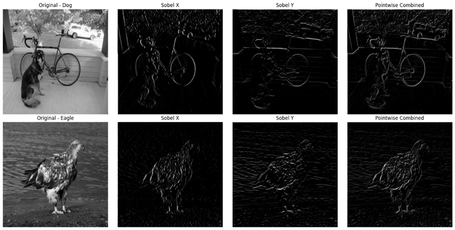以下は、Sobelフィルタを用いて画像のエッジを抽出し、Pointwise(1×1)畳み込みでチャネル方向に合成する例である。これはCNNの基本的な処理フローを視覚的に理解するのに有効である。