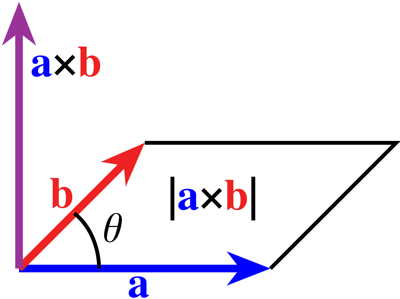 $$|\vec{a}×\vec{b}|=|a||b|sinθ$$
