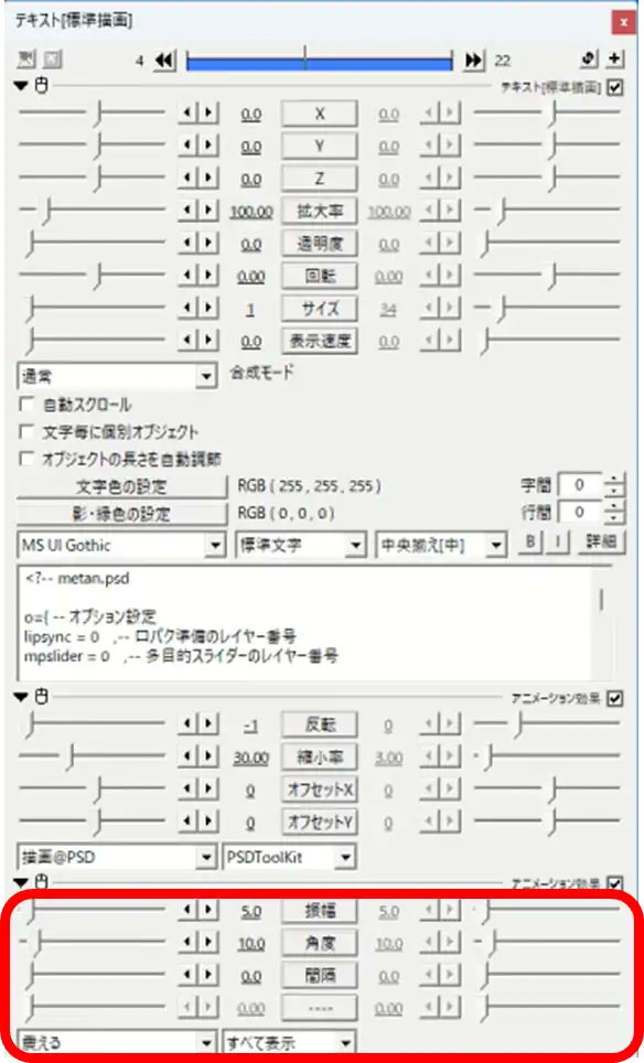 これを選ぶと、アニメーション効果のパラメータ設定に文字が追加される。